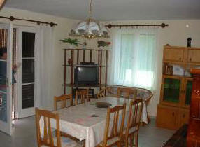 Kaffeemaschine mit angrenzender Essecke. Wohnzimmer mit TV-Sat, Kaminofen, ein