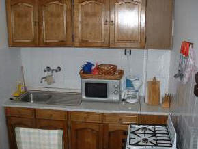 eine Küche komplett eingerichtet mit Gasherd, Kühlschrank, Mikrowelle,