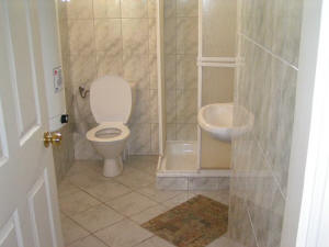 Farbfernseher, Badezimmer mit Dusche und mit WC.